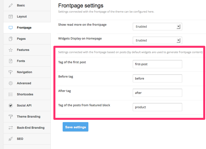In the latest theme update we’ve added a new template page – Frontpage, which can be used to create a frontpage based on posts. (previously the only way to create a frontpage was to configure widgets in specific widget areas).